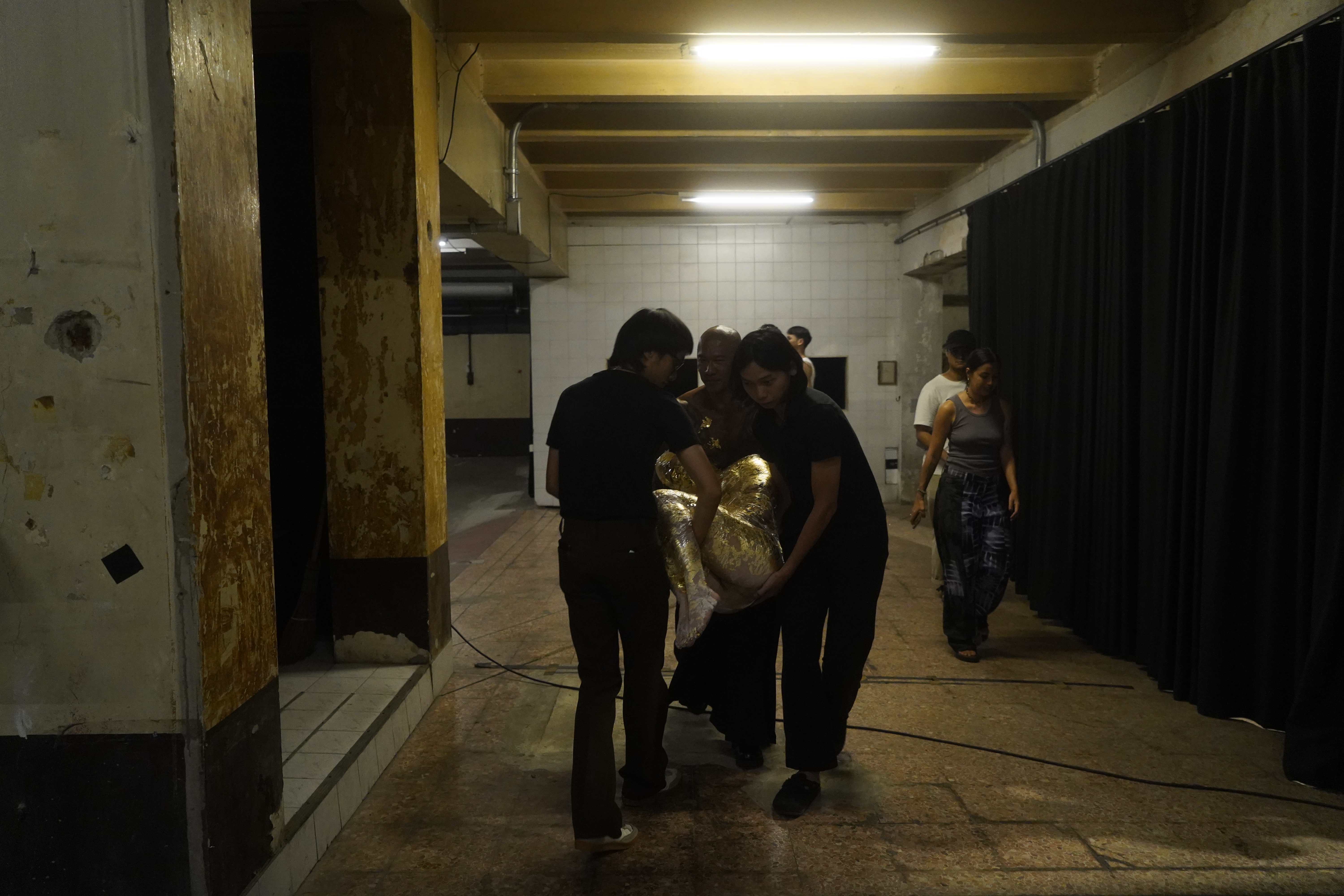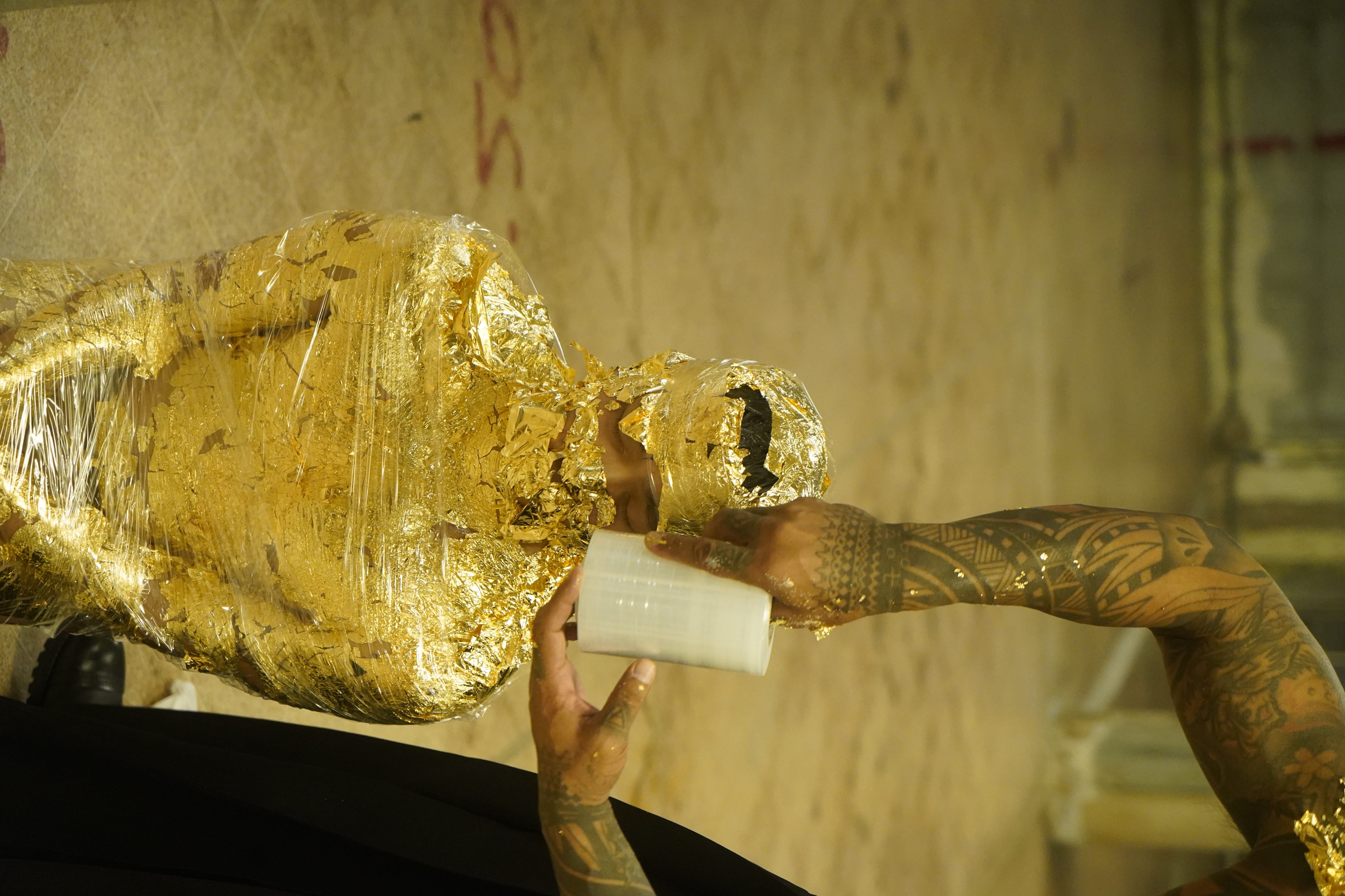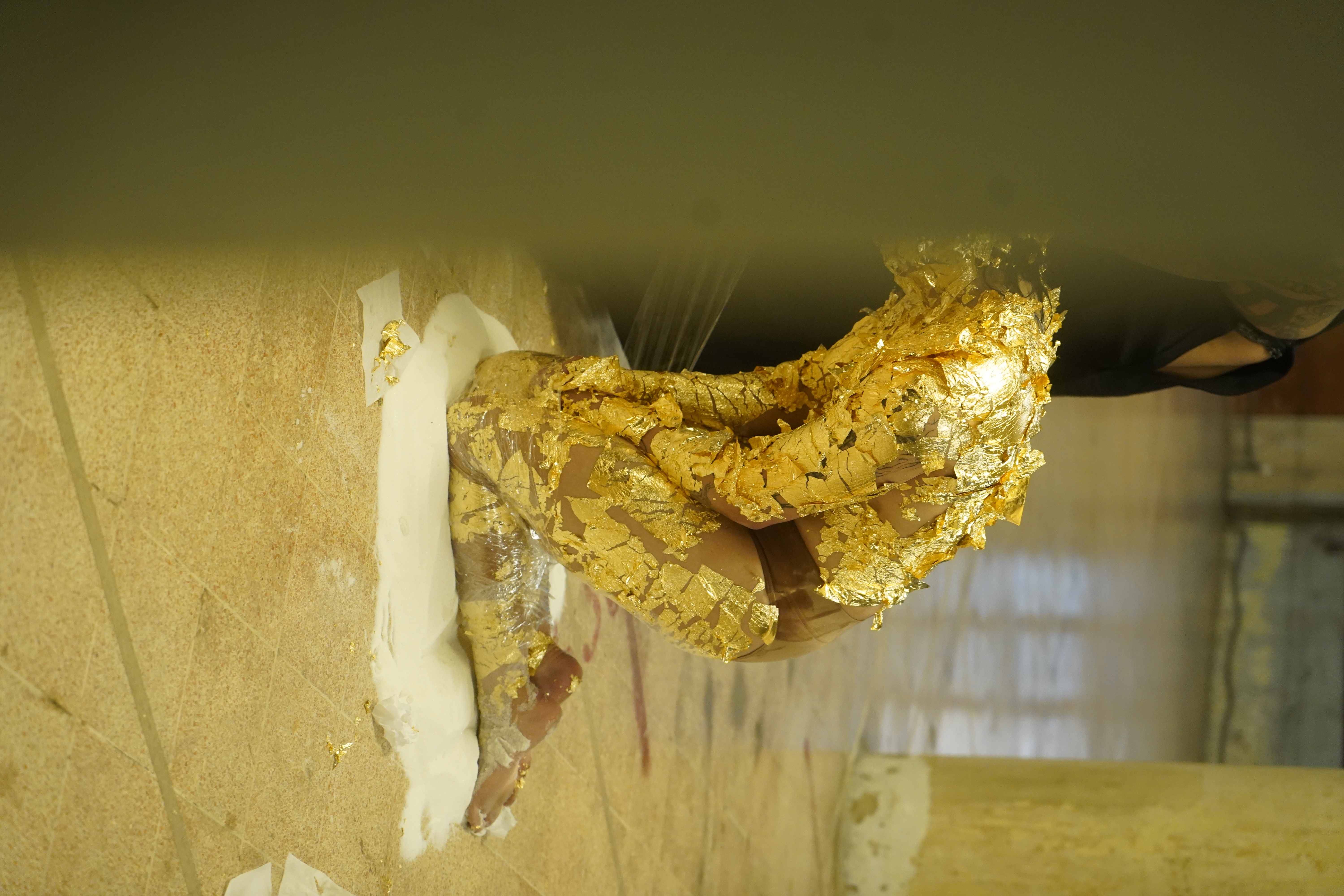 Audiences are invited to apply gold leaf directly onto my skin. Once my whole body is covered I am mummified, the gold congealing into a second skin. Carried into an adjacent room, I reemerge from this state and enter a slow, visceral choreography—weighted, trance-like, and shifting in bursts—leaving traces of gold in the space and upon those I encounter.