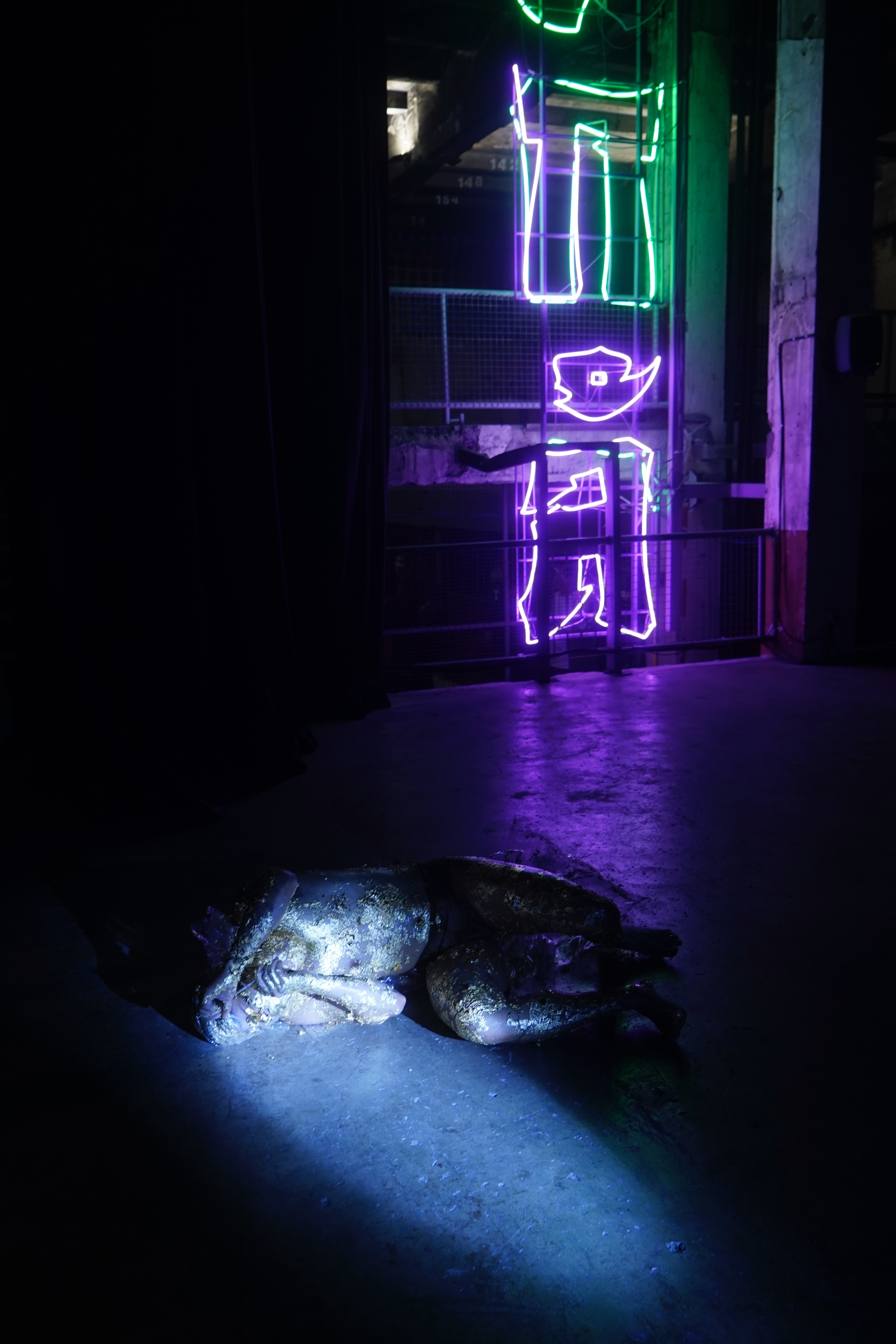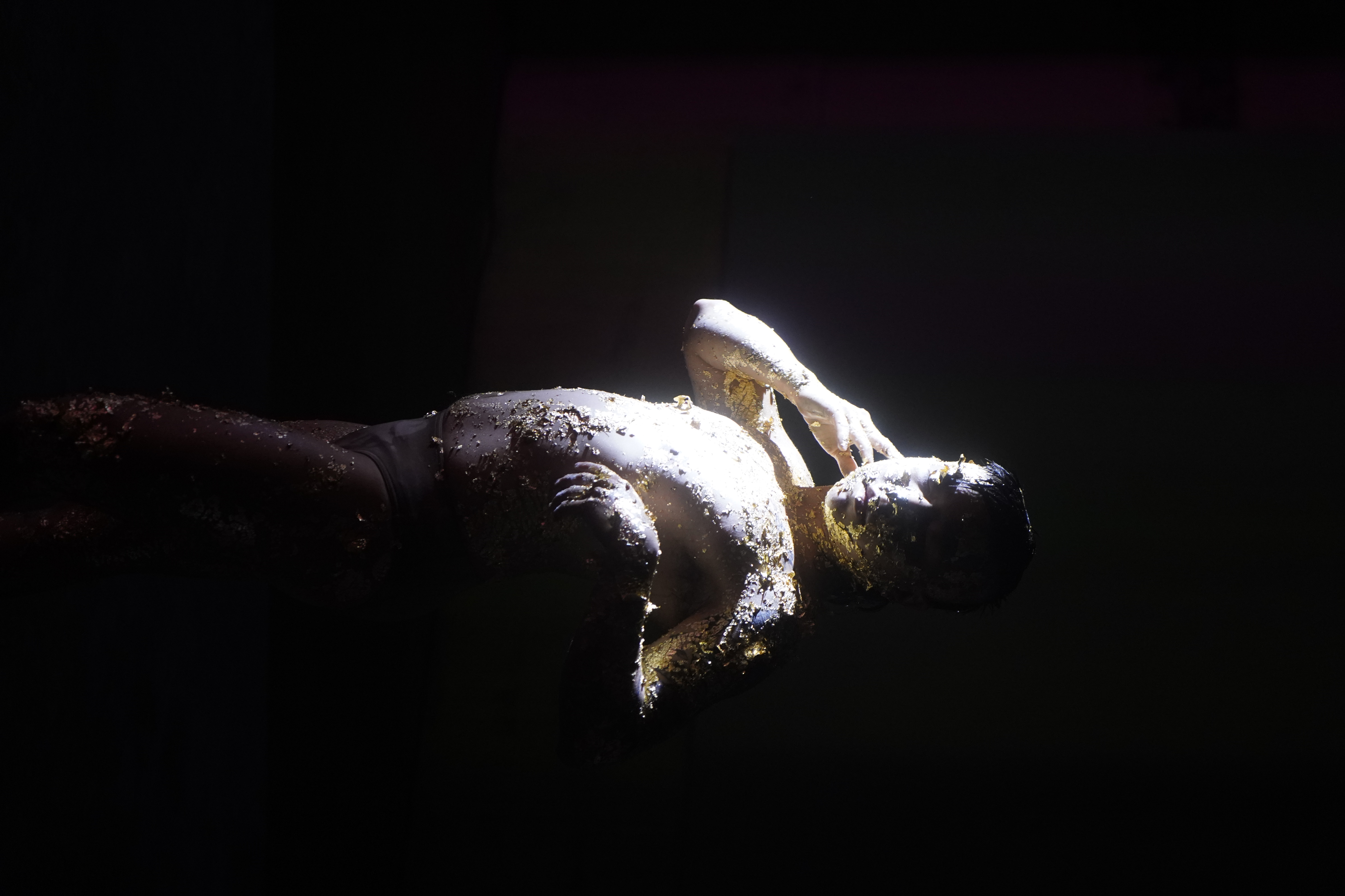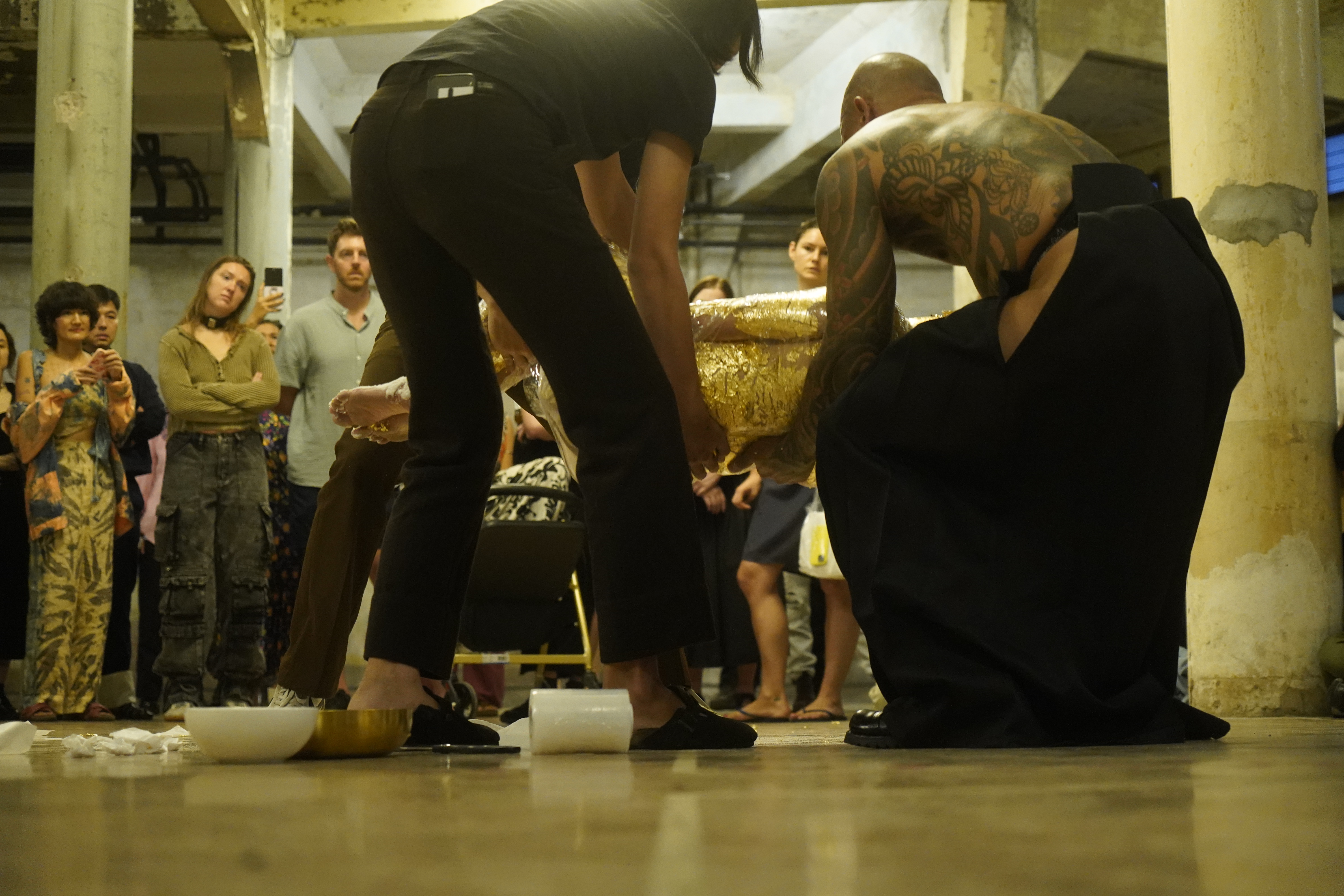Audiences are invited to apply gold leaf directly onto my skin. Once my whole body is covered I am mummified, the gold congealing into a second skin. Carried into an adjacent room, I reemerge from this state and enter a slow, visceral choreography—weighted, trance-like, and shifting in bursts—leaving traces of gold in the space and upon those I encounter.