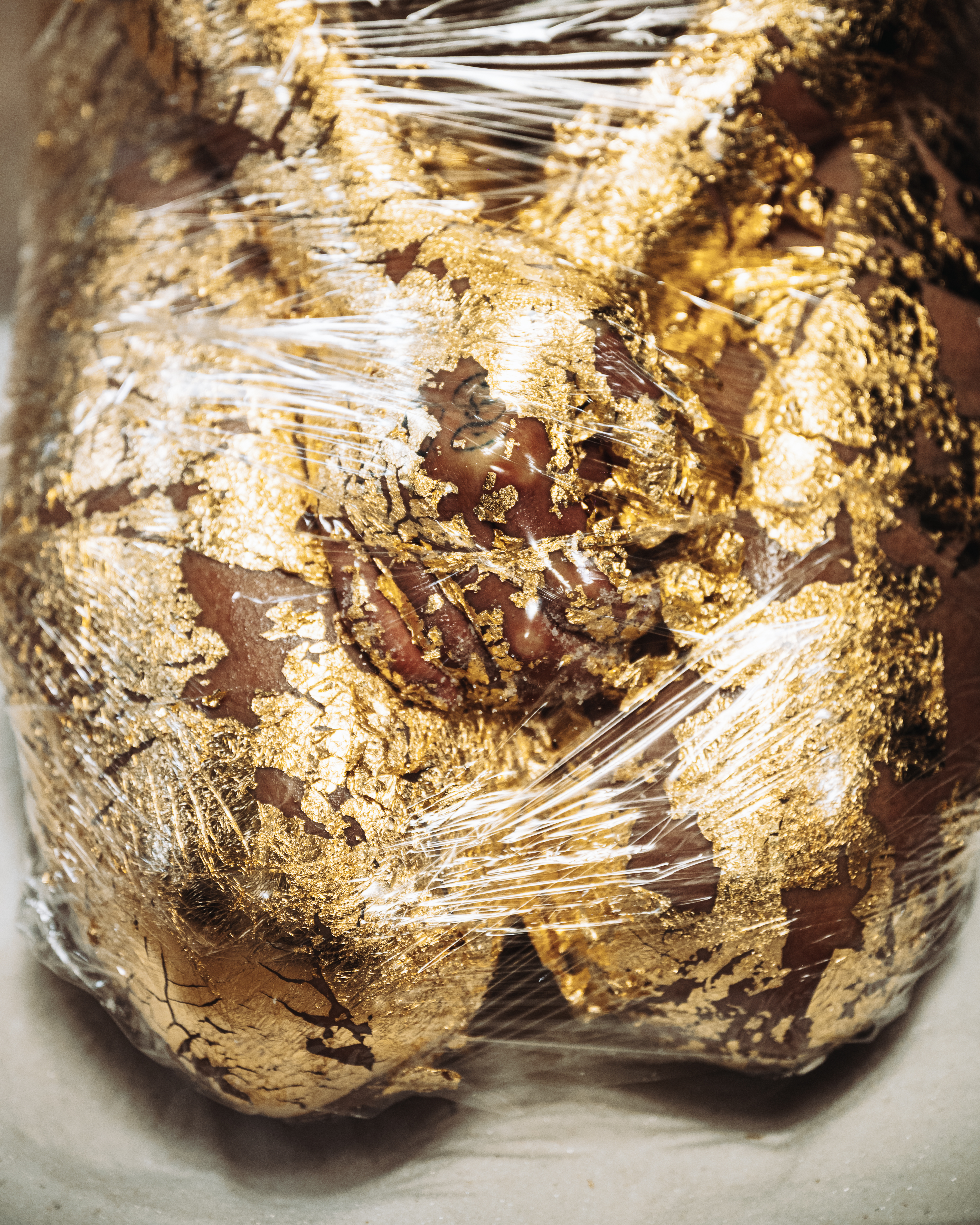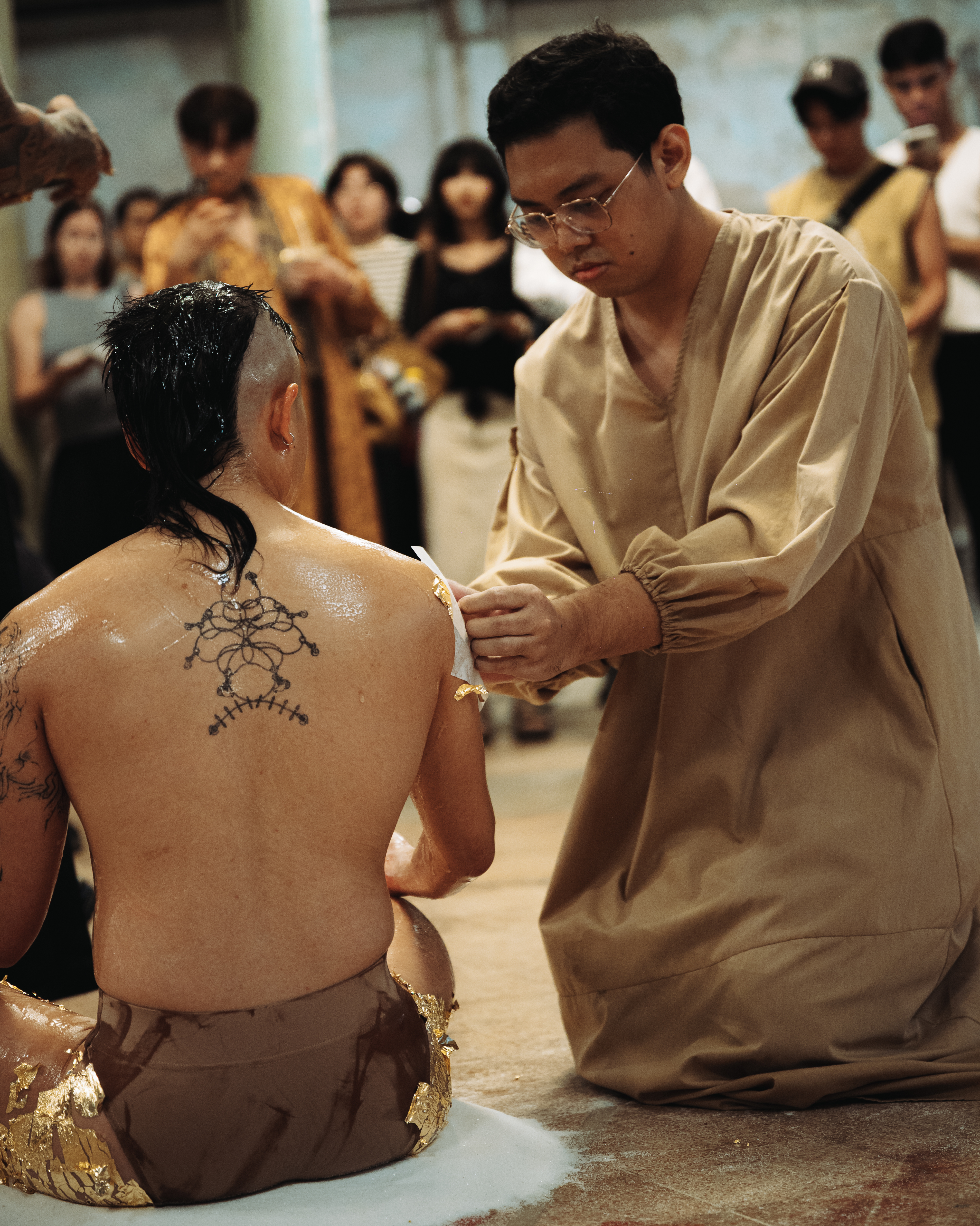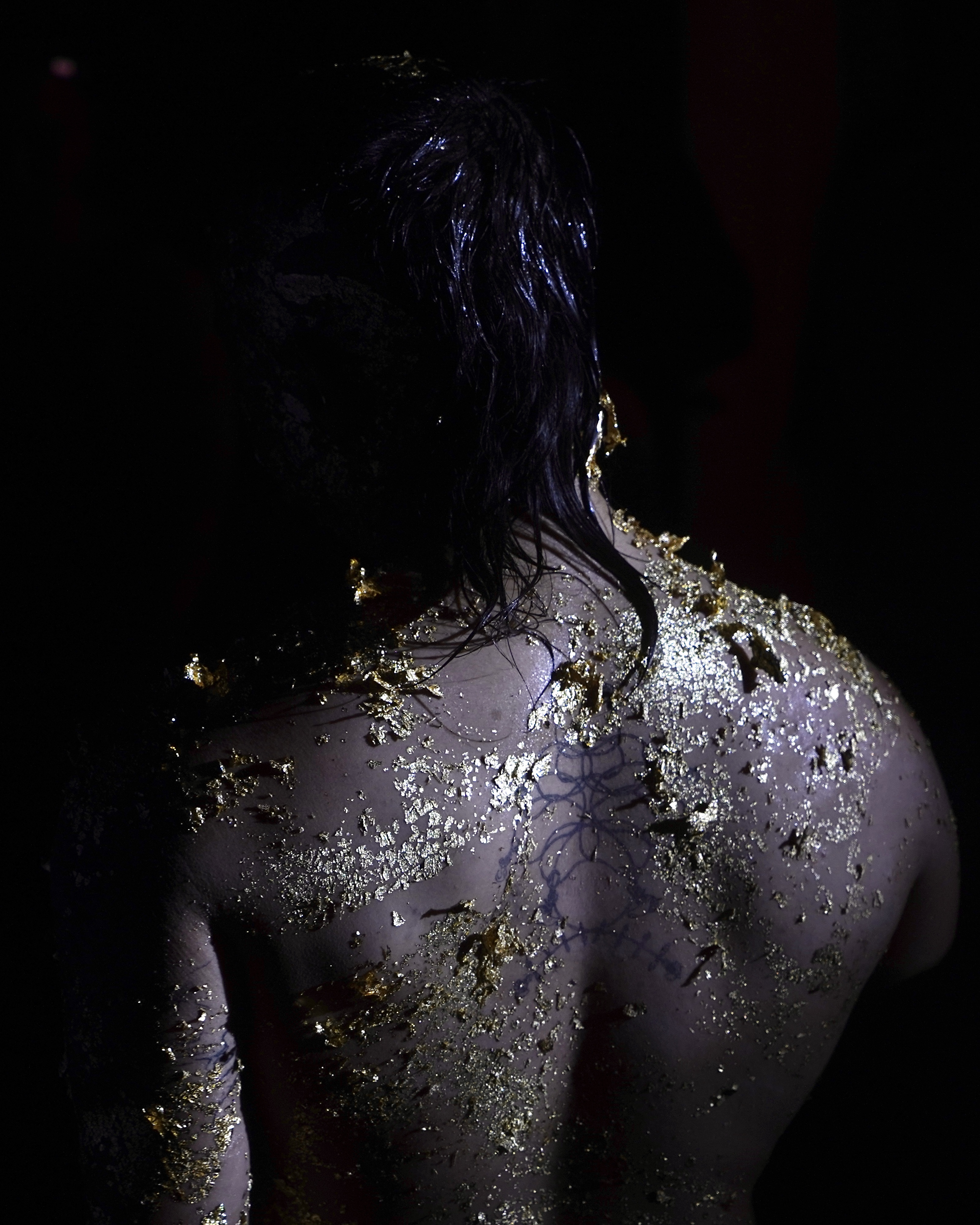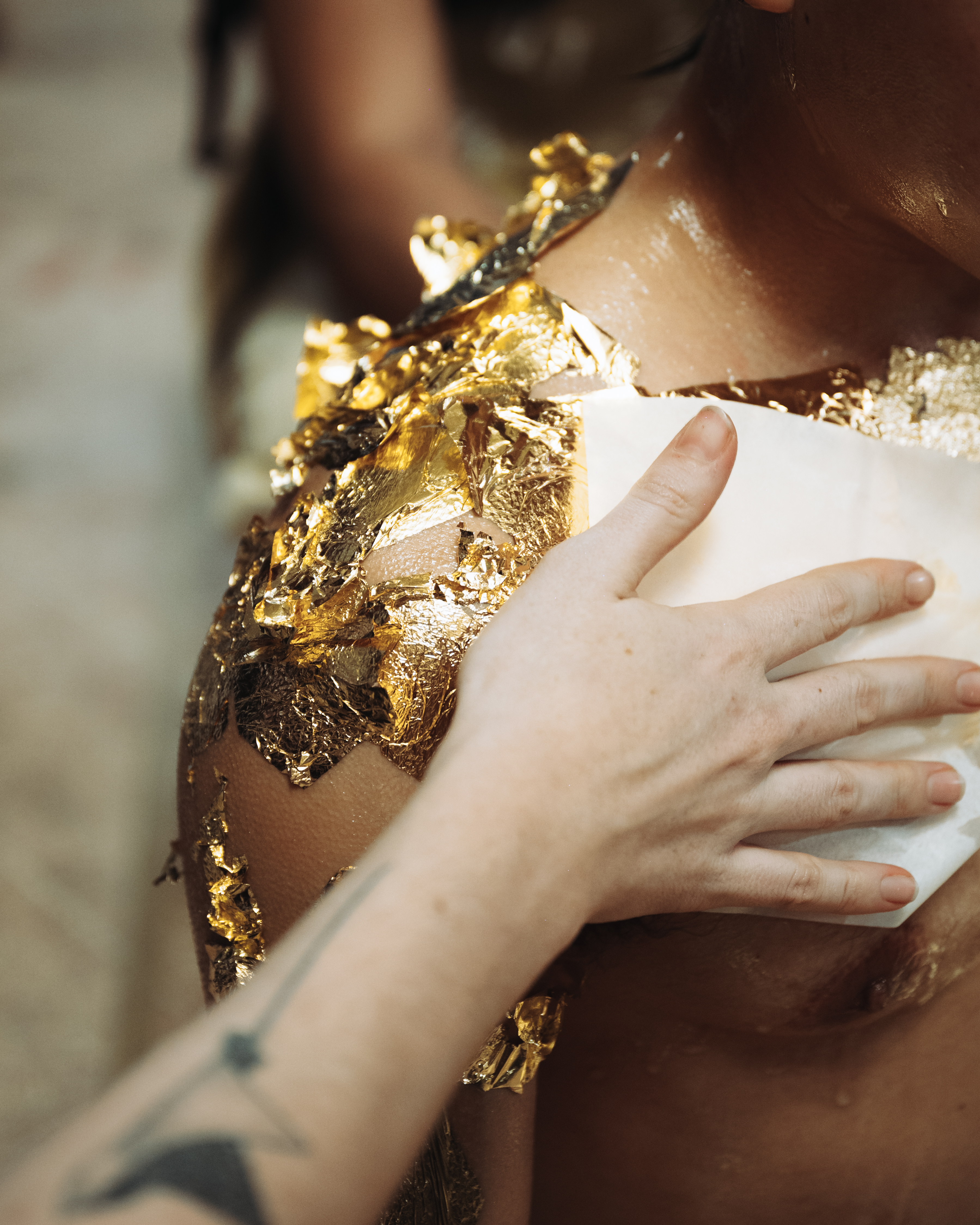 Inspired by Thai rituals of gilding Buddha statues with gold leaf as acts of devotion, and the mummification of Chinese monks in gold, Gilding II is a blessing ritual for the living queer and trans body.
