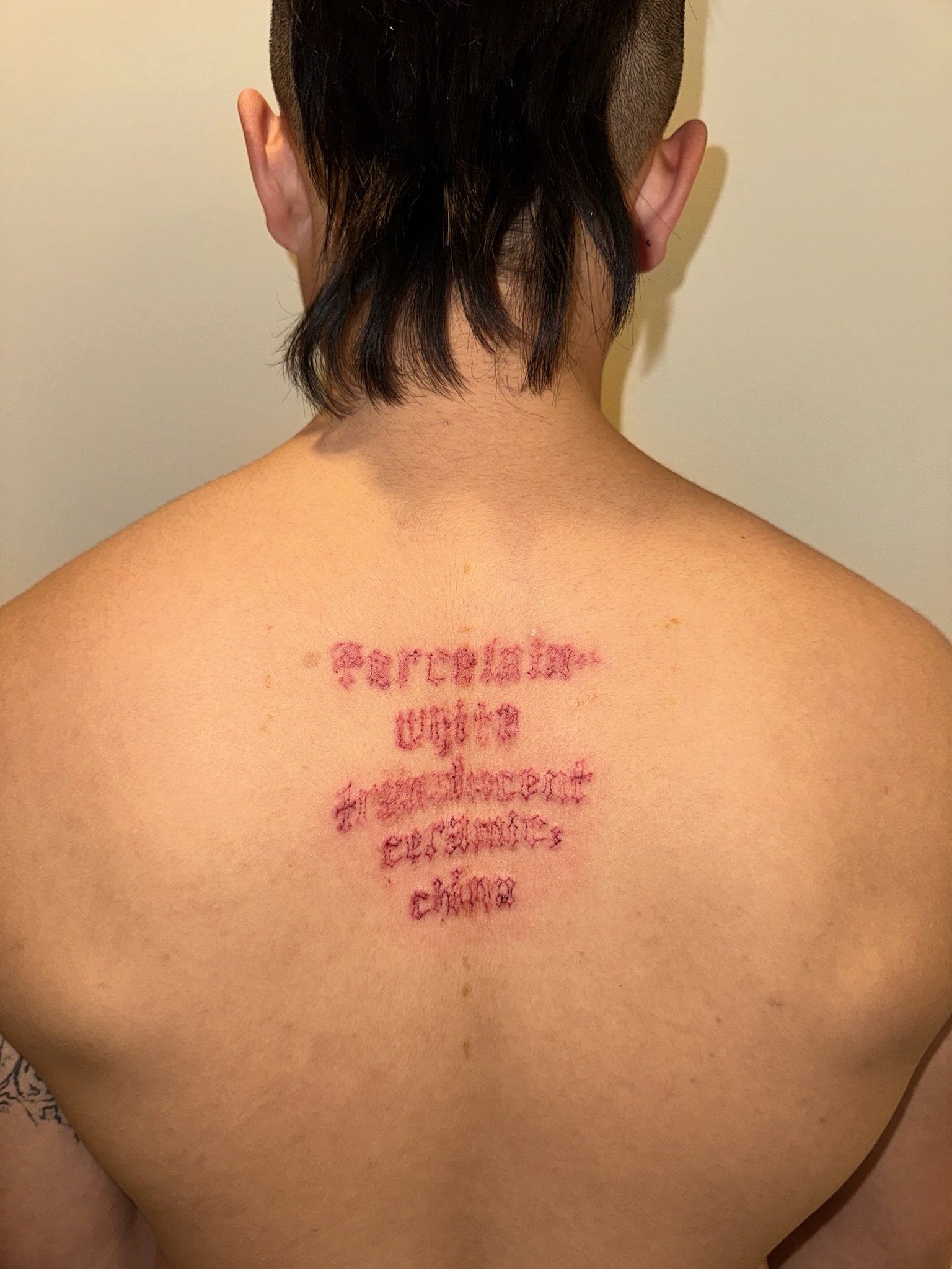 In this piece the definition of the word porcelain is etched into skin using a tattoo machine, without ink.