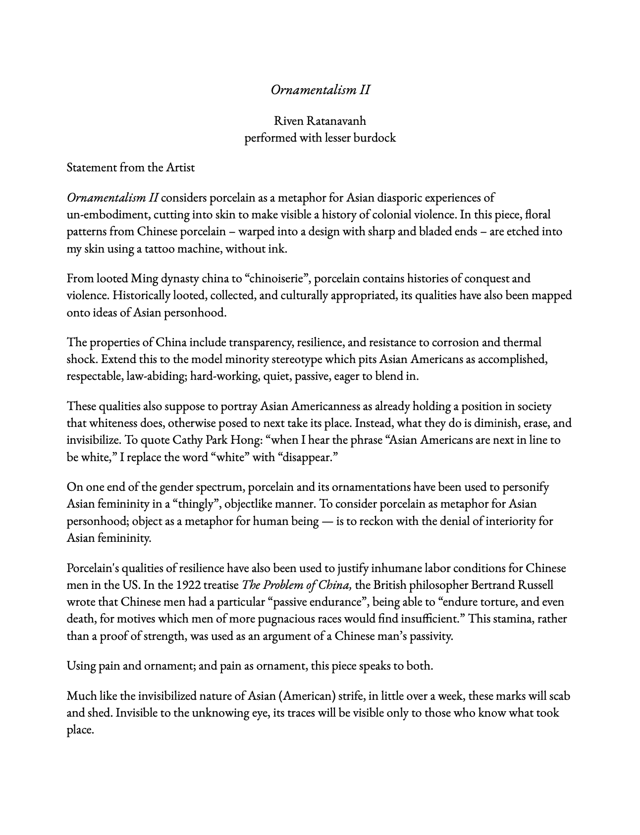 Ornamentalism II cuts into skin to make visible a history of colonial violence, using porcelain as a metaphor for Asian diasporic experiences of un-embodiment . Floral patterns from Chinese porcelain, warped into sharp bladed forms, are etched into my skin with a tattoo machine, without ink. Much like the invisibilized nature of Asian (American) strife, these marks scab and shed within weeks, leaving traces barely visible to the naked eye, only visible upon the closest scrutiny for those who know what took place.