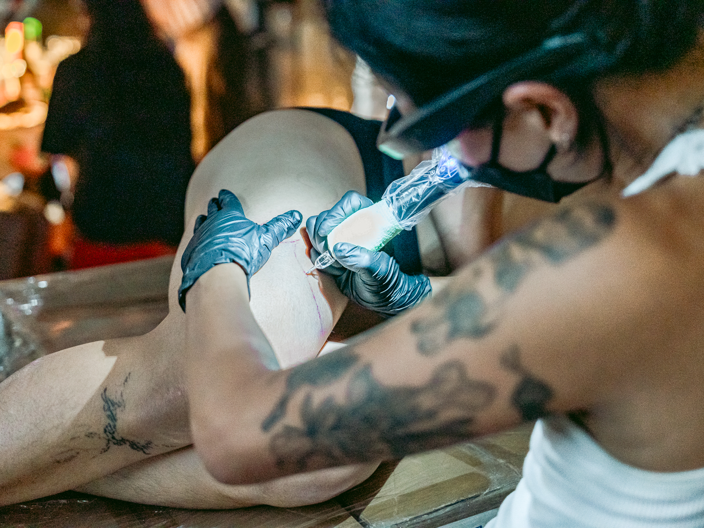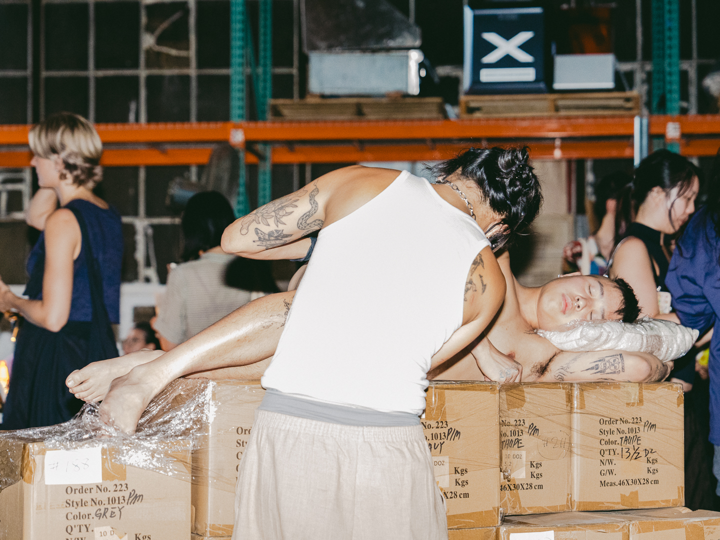 Performed at Shisanwu Warehouse, a pantyhose import/export warehouse in Queens, NY, I am tattooed by Korean tattooer lesser burdock, lying on top of boxes labelled “Made in China” and “Made in Korea”.